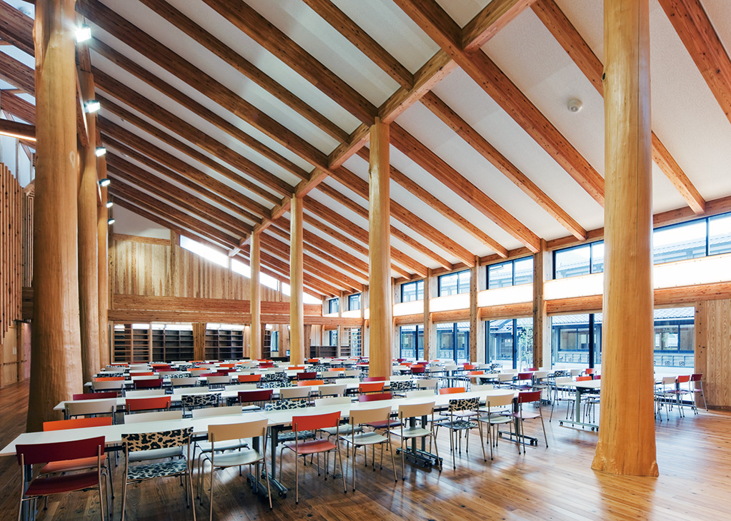 また、特別支援教室や障がい児童室、クールダウン室、父兄相談室の配置など学校側の要望についても適切に設計に反映されている。このほか、校舎の構造体や内装には多くの木材(地場産材)が活用されており、新校舎への移転後の不登校、問題行動の減少など、木造建築が生徒の情操に対しても良い影響を与えるほか、地域の人々の自慢の学校にもなっていることが紹介されている。
